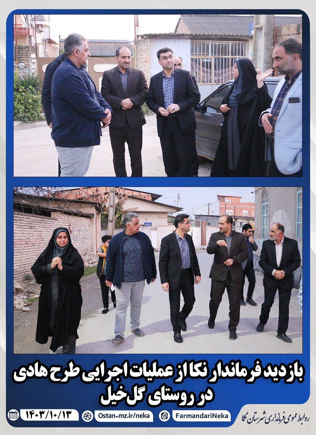 عصر روز پنجشنبه مورخه ۱۳ دی ۱۴۰۳ دکترداودی فرماندار نکا با همراهی بخشدار مرکزی، دهیار روستا و اعضای شورا با حضور در روستای گلخیل از عملیات اجرایی طرح هادی در این روستا بازدید نمود.