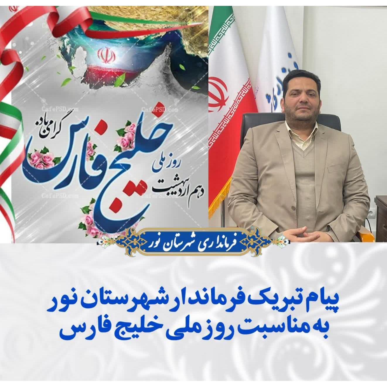 اینجانب ضمن گرامیداشت یاد و خاطره تمامی شهدا و مجاهدانی را که با فداکاری و ایثار در مقابل دشمنان ایستادگی کردند، بر خود لازم می دانم روز ملی خلیج فارس، بخشی ناگسستنی از هویت ملی ایران را، به عموم ملت ایران خصوصا مردم شهرستان نور تبریک گفته و از خداوند متعال سربلندی همه آنان که با حفظ اصالت و هویت، در راه پاسداری ازاین میراث گرانبها و سربلندی ایران عزیز کوشش میکنند را خواستارم.