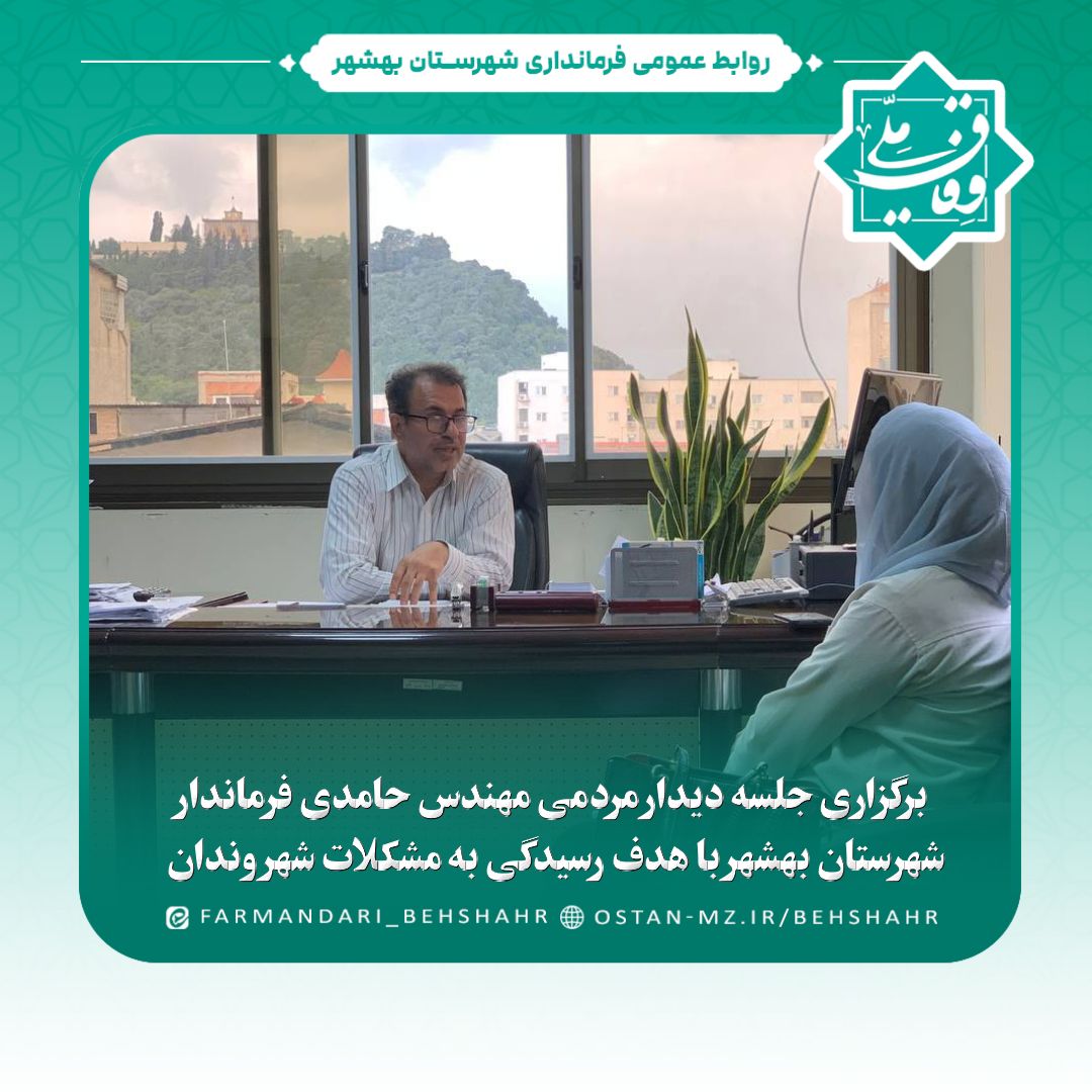 در چارچوب برنامههای هفتگی ارتباط مستقیم با مردم و با هدف پاسخگویی به مطالبات عمومی، جلسهای با حضور مهندس حامدی، فرماندار شهرستان بهشهر، جهت بررسی مشکلات مطرحشده از سوی شهروندان برگزار شد.