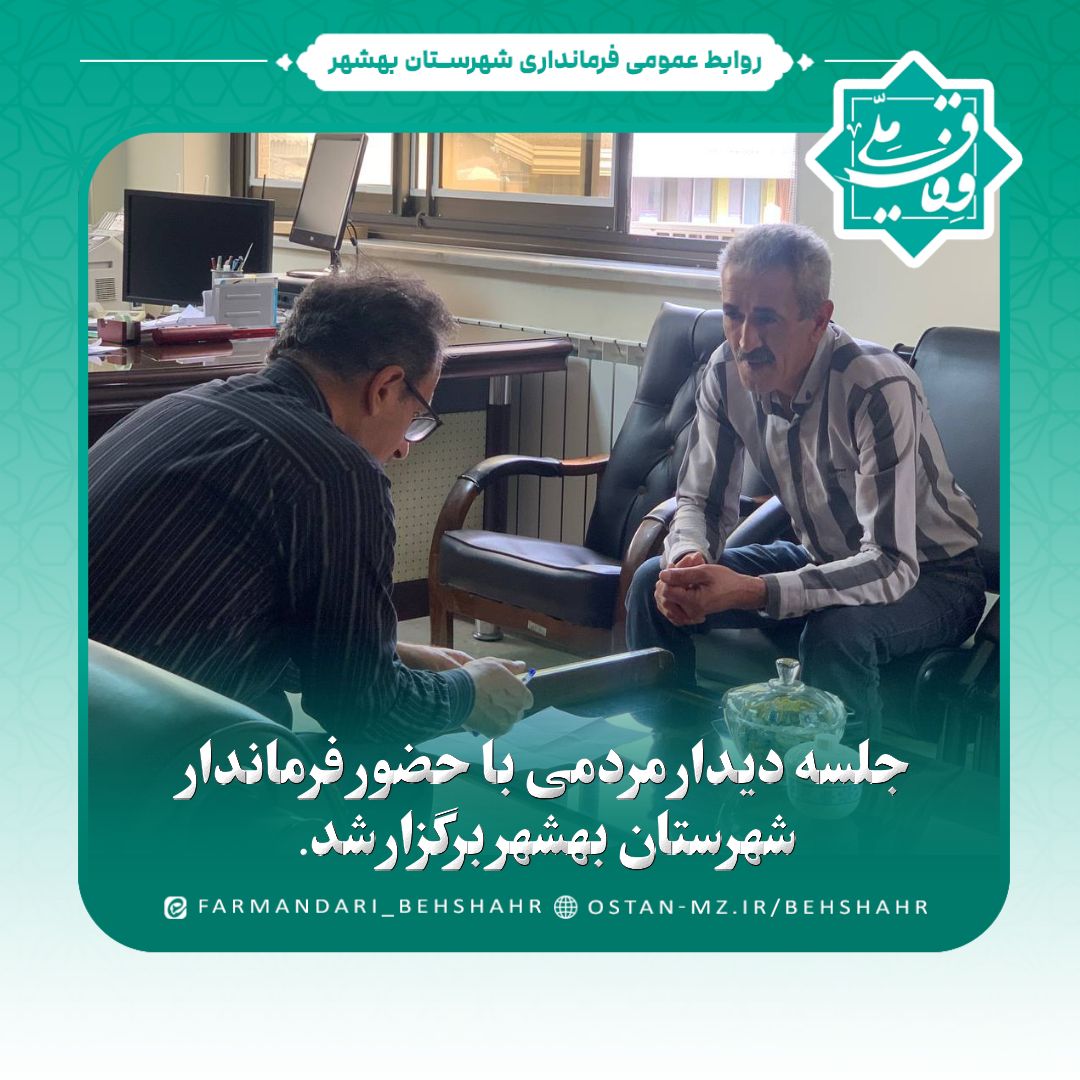 جلسه دیدار مردمی با هدف بررسی مشکلات شهروندان و پیگیری مطالبات عمومی، با حضور فرماندار شهرستان بهشهر در محل فرمانداری برگزار شد.