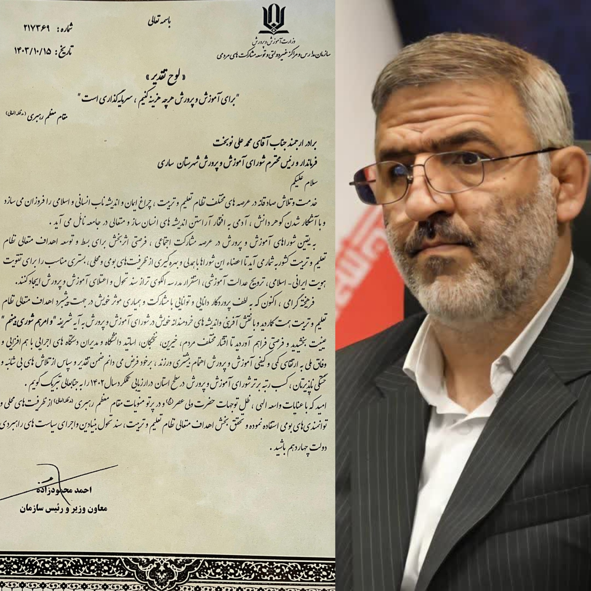 وزارت آموزش و پرورش و سازمان مدارس و مراکز غیردولتی و توسعه مشارکتهای مردمی، طی لوحی از دکتر محمدعلی نوبخت، فرماندار شهرستان ساری و رئیس شورای آموزش و پرورش این شهرستان، به پاس اقدامات مؤثر، برنامهریزیهای راهبردی و اهتمام ویژه در گسترش عدالت آموزشی و حمایت از زیرساختهای آموزشی، تقدیر کردند. در این لوح که با امضای احمد محمودزاده، معاون وزیر و رئیس سازمان مدارس و مراکز غیردولتی و توسعه مشارکتهای مردمی، به دکتر نوبخت اهدا شده است، ضمن تأکید بر نقش راهبردی آموزش و پرورش در ساخت آینده کشور، از تلاشهای وی در پشتیبانی از برنامههای تحولی آموزش و پرورش، همافزایی با مدیران و فرهنگیان، و پیگیری پروژههای مدرسهسازی در شهرستان ساری بهعنوان «فرماندار برتر استان» قدردانی شده است.