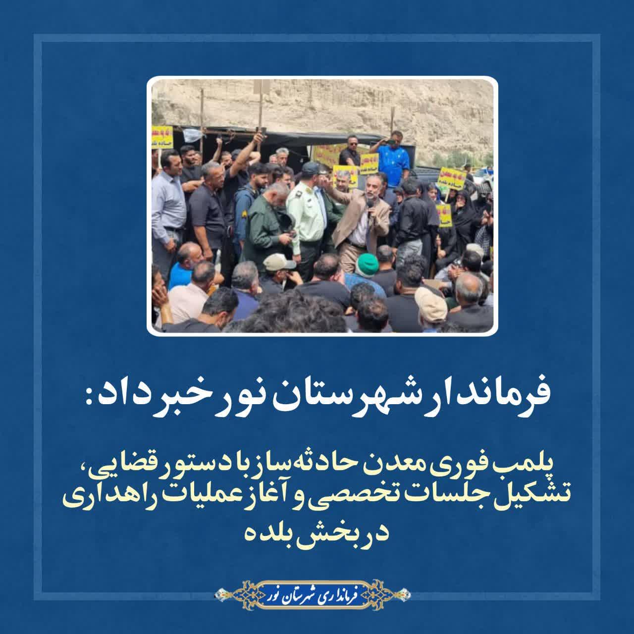 فرماندار شهرستان نور در جمع مردم بخش بلده با تسلیت به خانوادههای داغدار حادثه اخیر و اهالی منطقه، اظهار داشت: از نخستین ساعات وقوع این حادثه، شخصاً از مرکز شهرستان به سمت بلده حرکت کردم و پیش از رسیدن خانواده متوفیان در محل حاضر شدم. در همان محل نیز دستور پلمب معدن حادثهخیز صادر شد.