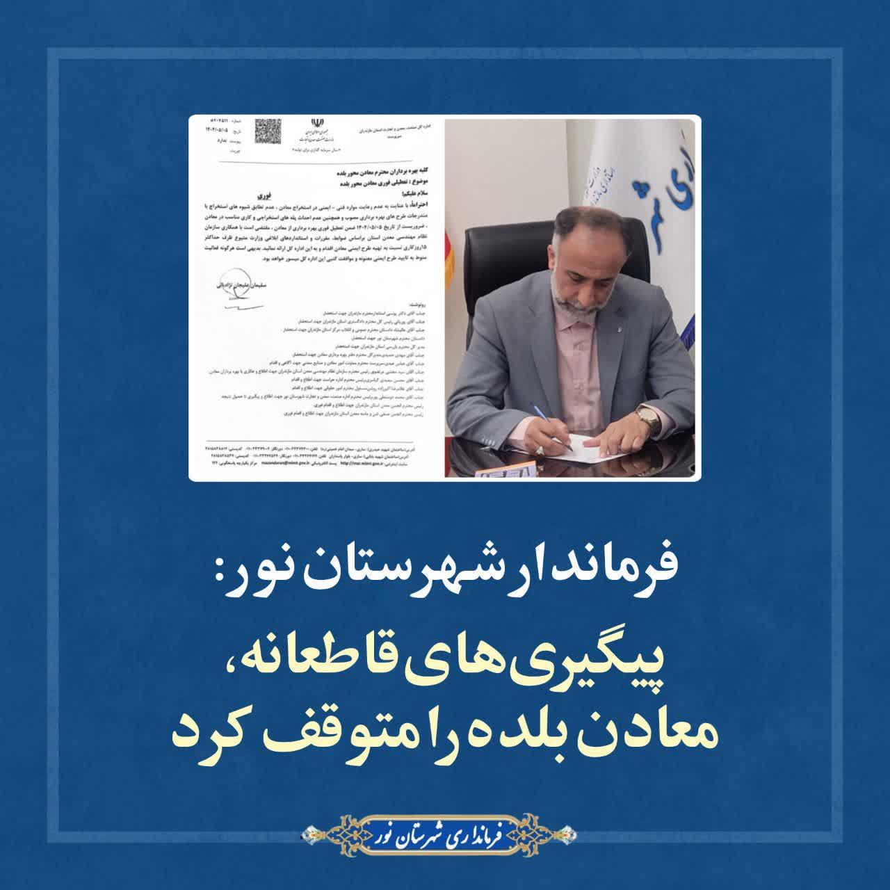 پس از مطالبهگری اهالی منطقه بلده نسبت به فعالیت معادن و اثرات زیستمحیطی و اجتماعی آن، "تورج آتشفراز" نماینده عالی دولت در شهرستان نور، دکتر فیاضی نماینده مردم نور و محمودآباد درمجلس شورای اسلامی و دیگر مسئولین با پیگیریهای مستمر و جدی، موفق به اخذ دستور فوری توقف فعالیت این معادن شد. این تصمیم در راستای حفظ منافع عمومی، محیط زیست و آرامش اهالی منطقه اتخاذ شده است.