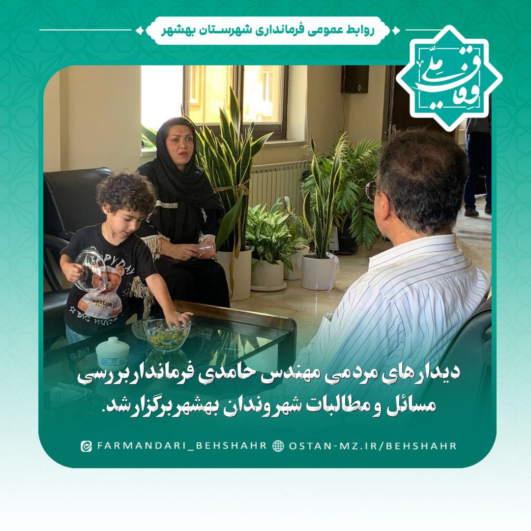 دیدار های مردمی مهندس حامدی فرماندار بررسی مسائل و مطالبات شهروندان بهشهر برگزار شد.
