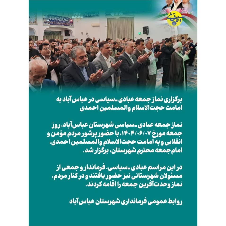 نماز جمعه عبادی ـ سیاسی شهرستان عباسآباد، روز جمعه مورخ ۱۴۰۴/۰۶/۰۷، با حضور پرشور مردم مؤمن و انقلابی و به امامت حجتالاسلام والمسلمین احمدی، امامجمعه محترم شهرستان، برگزار شد.
