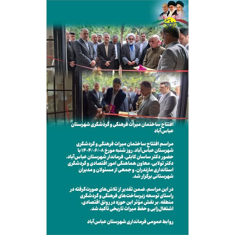 مراسم افتتاح ساختمان میراث فرهنگی و گردشگری شهرستان عباسآباد، روز شنبه مورخ ۱۴۰۴/۰۶/۰۸ با حضور دکتر ساسان کابلی، فرماندار شهرستان عباسآباد، دکتر تولایی، معاون هماهنگی امور اقتصادی و گردشگری استانداری مازندران، و جمعی از مسئولان و مدیران شهرستانی برگزار شد.