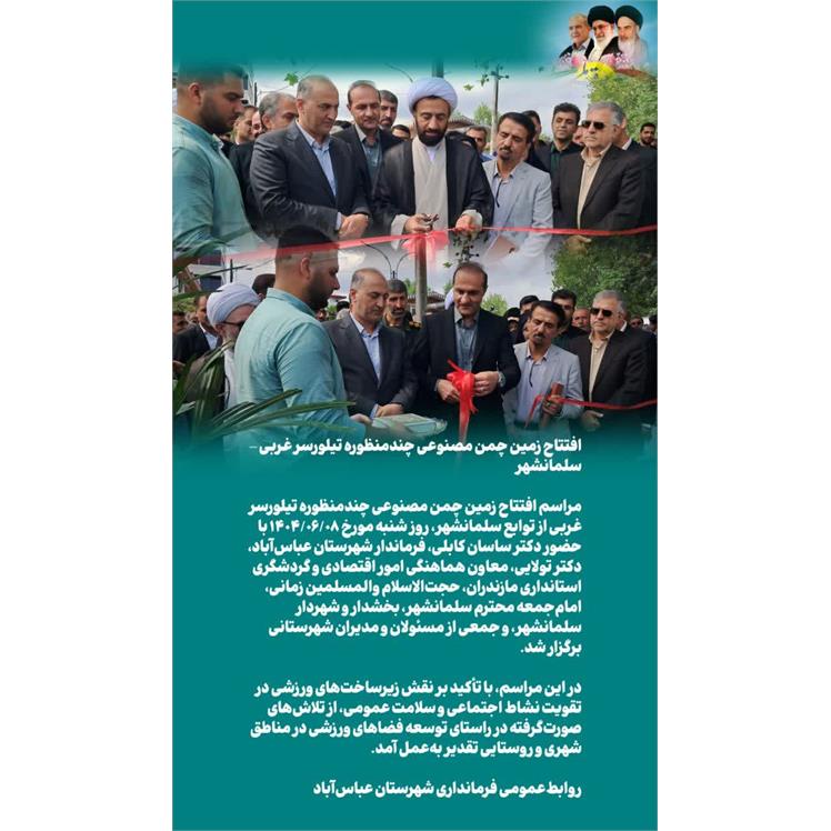 افتتاح زمین چمن مصنوعی چندمنظوره تیلورسر غربی – سلمانشهر مراسم افتتاح زمین چمن مصنوعی چندمنظوره تیلورسر غربی از توابع سلمانشهر، روز شنبه مورخ ۱۴۰۴/۰۶/۰۸ با حضور دکتر ساسان کابلی، فرماندار شهرستان عباسآباد، دکتر تولایی، معاون هماهنگی امور اقتصادی و گردشگری استانداری مازندران، حجتالاسلام والمسلمین زمانی، امامجمعه محترم سلمانشهر، بخشدار و شهردار سلمانشهر، و جمعی از مسئولان و مدیران شهرستانی برگزار شد.