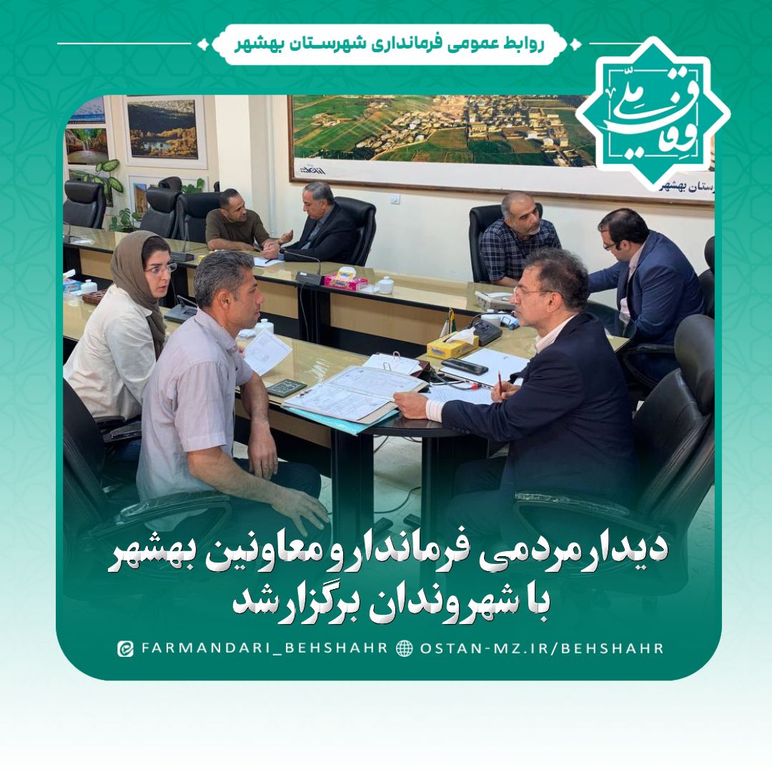 در ادامه برنامههای منظم ارتباط مستقیم با مردم و رسیدگی به مسائل شهروندان، نشست دیدار مردمی با حضور مهندس حامدی، فرماندار شهرستان بهشهر، برگزار شد. در این دیدار که روز سهشنبه در محل اتاق فرماندار انجام گرفت، معاونین فرماندار در حوزههای عمرانی، سیاسیامنیتی و برنامهریزی نیز حضور داشتند.در جریان این دیدار، جمعی از شهروندان از نقاط مختلف شهرستان با طرح مسائل و دغدغههای خود در زمینههای گوناگون از جمله عمرانی، خدمات شهری، اشتغال، مسائل اجتماعی و مشکلات روستایی، خواستار بررسی و پیگیری مسئولان شدند.فرماندار بهشهر و معاونان وی ضمن بررسی درخواستها، دستورات لازم را برای رسیدگی به برخی از مشکلات مطرحشده صادر کردند و بر پیگیری دقیق و مستمر موضوعات تا حصول نتیجه تأکید نمودند.