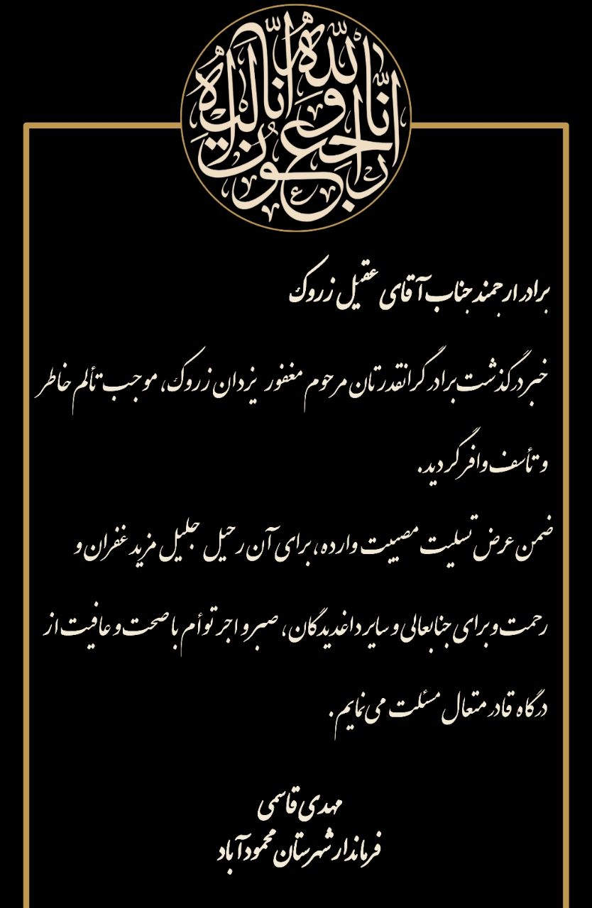 پیام تسلیت فرماندار محمودآباد در پی درگذشت مرحوم یزدان زروک