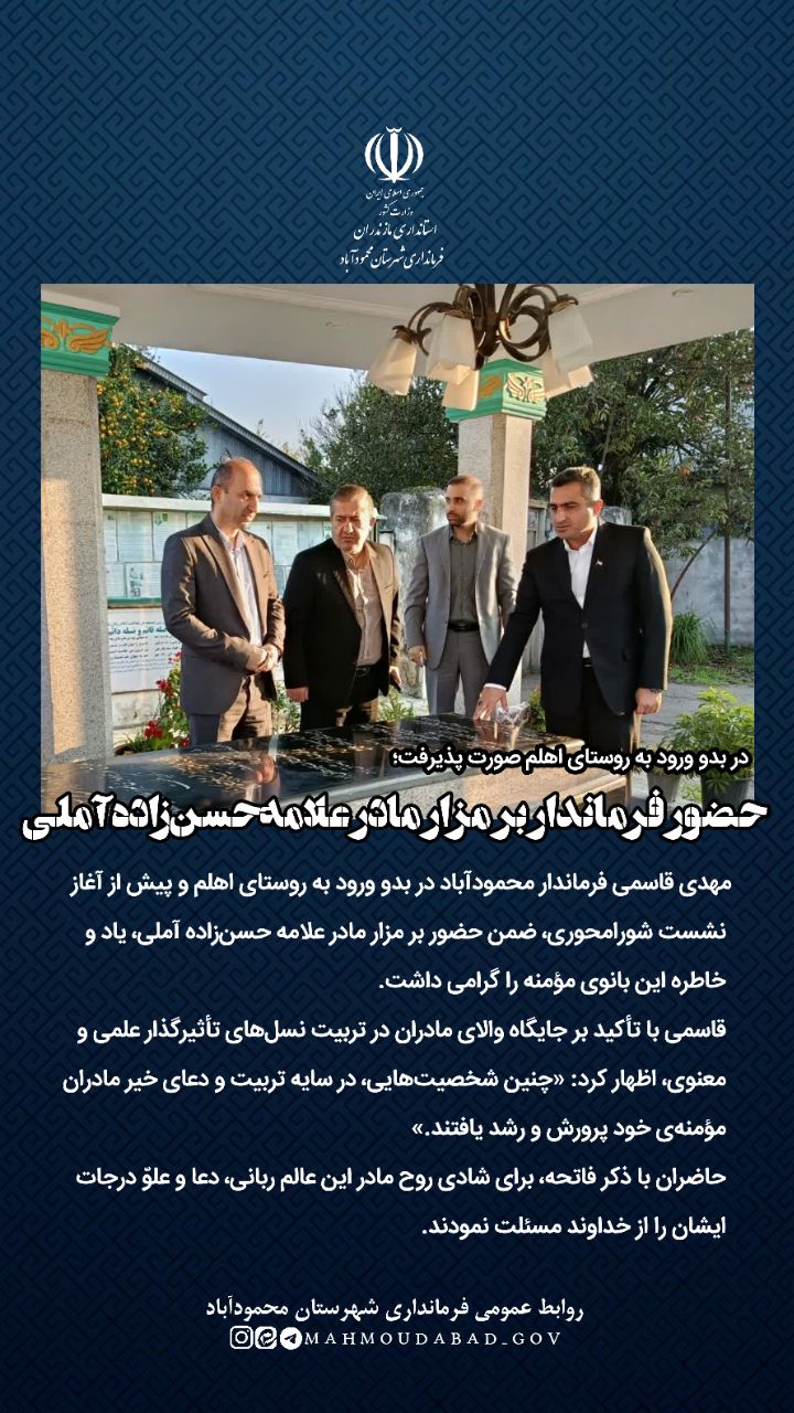 مهدی قاسمی فرماندار محمودآباد در بدو ورود به روستای اهلم و پیش از آغاز نشست شورامحوری، ضمن حضور بر مزار مادر علامه حسنزاده آملی، یاد و خاطره این بانوی مؤمنه را گرامی داشت.