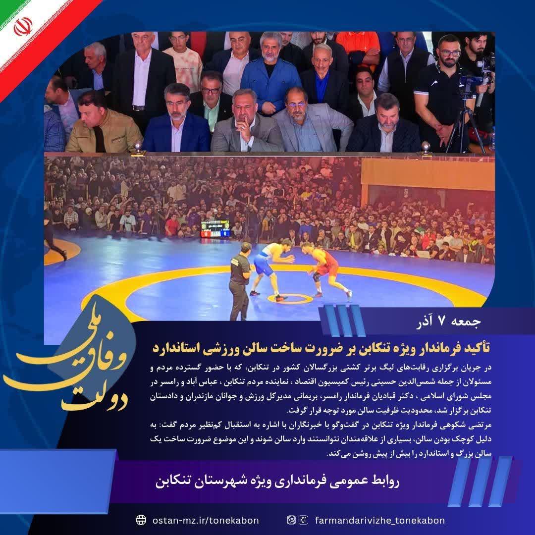 در جریان برگزاری رقابتهای لیگ برتر کشتی بزرگسالان کشور در تنکابن، که با حضور گسترده مردم و مسئولان از جمله شمسالدین حسینی رئیس کمیسیون اقتصاد ، نماینده مردم تنکابن ، عباس آباد و رامسر در مجلس شورای اسلامی ، دکتر قبادیان فرماندار رامسر، بریمانی مدیرکل ورزش و جوانان مازندران و دادستان تنکابن برگزار شد، محدودیت ظرفیت سالن مورد توجه قرار گرفت.