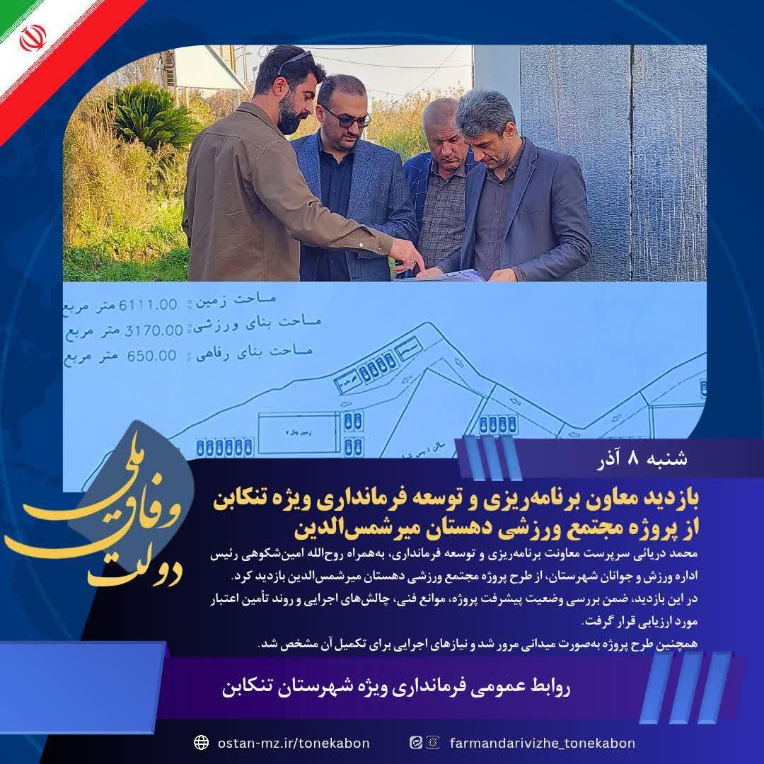 بهگزارش روابطعمومی فرمانداری ویژه شهرستان تنکابن، محمد دریائی سرپرست معاونت برنامهریزی و توسعه فرمانداری، بههمراه روحالله امینشکوهی رئیس اداره ورزش و جوانان شهرستان، از طرح پروژه مجتمع ورزشی دهستان میرشمسالدین بازدید کرد