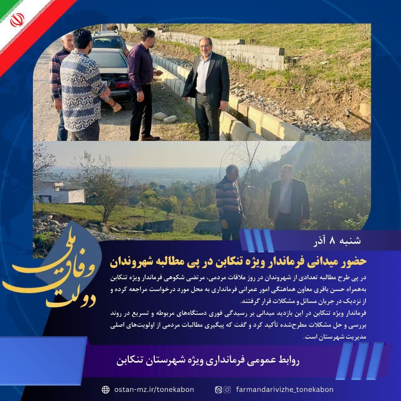 در پی طرح مطالبه تعدادی از شهروندان در روز ملاقات مردمی، مرتضی شکوهی فرماندار ویژه تنکابن بههمراه حسن باقری معاون هماهنگی امور عمرانی فرمانداری به محل مورد درخواست مراجعه کرده و از نزدیک در جریان مسائل و مشکلات قرار گرفتند.