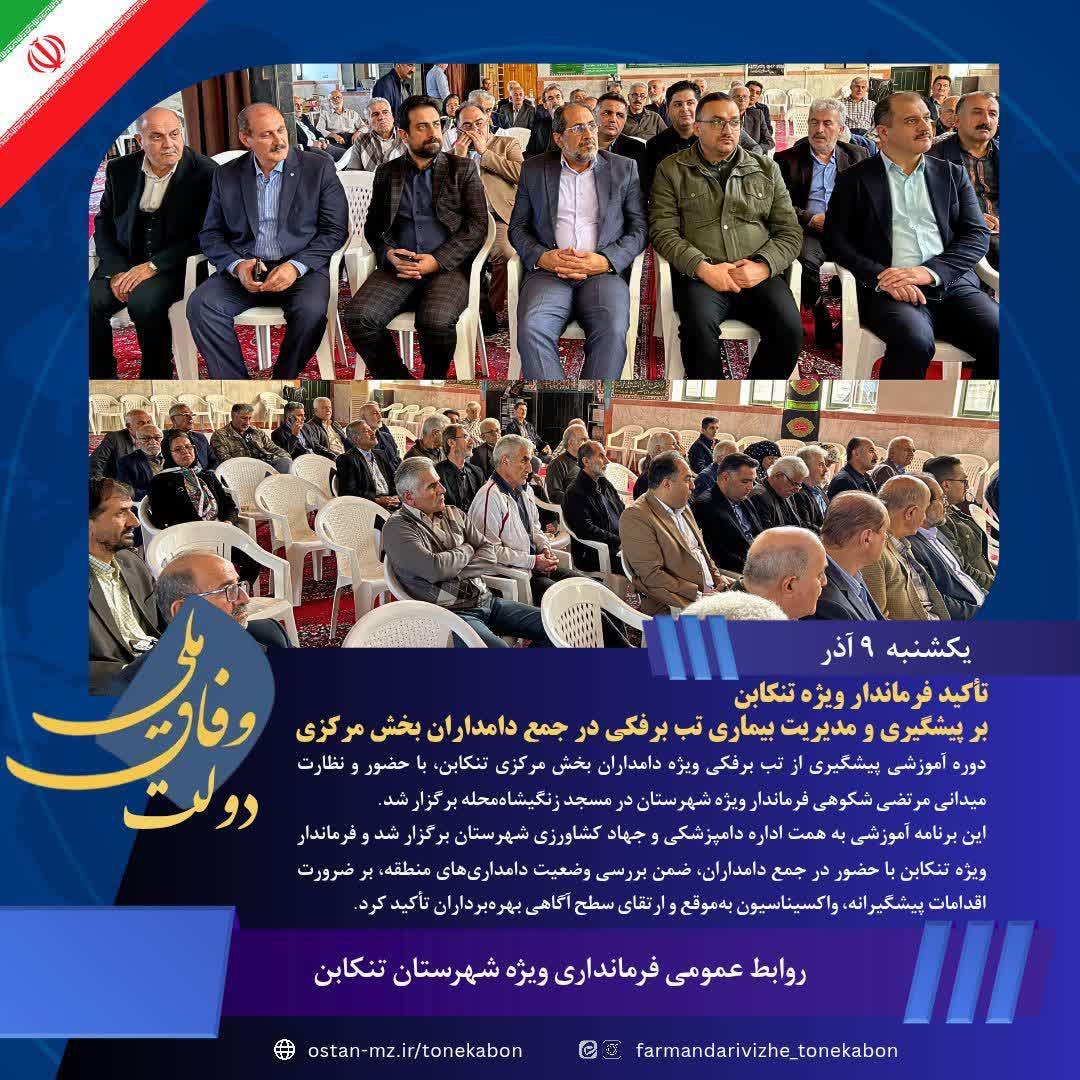 دوره آموزشی پیشگیری از تب برفکی ویژه دامداران بخش مرکزی تنکابن، با حضور و نظارت میدانی مرتضی شکوهی فرماندار ویژه شهرستان در مسجد زنگیشاهمحله برگزار شد.