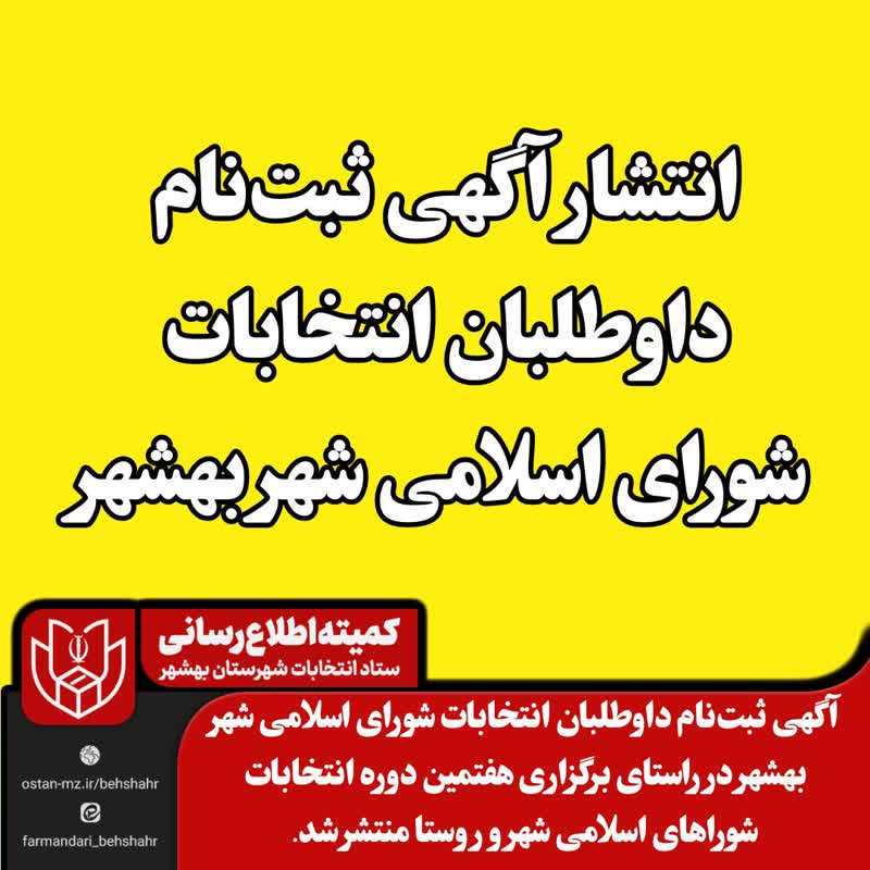 - به آگاهی عموم شهروندان میرساند در چارچوب برنامههای اجرایی هفتمین دوره انتخابات شوراهای اسلامی شهر و روستا، آگهی ثبتنام داوطلبان انتخابات شورای اسلامی شهر بهشهر از سوی کمیته اطلاعرسانی شهرستان بهشهر منتشر شده است. داوطلبان واجد شرایط میتوانند در مهلت مقرر قانونی و طبق ضوابط و شرایط مندرج در آگهی، نسبت به ثبتنام اقدام نمایند.