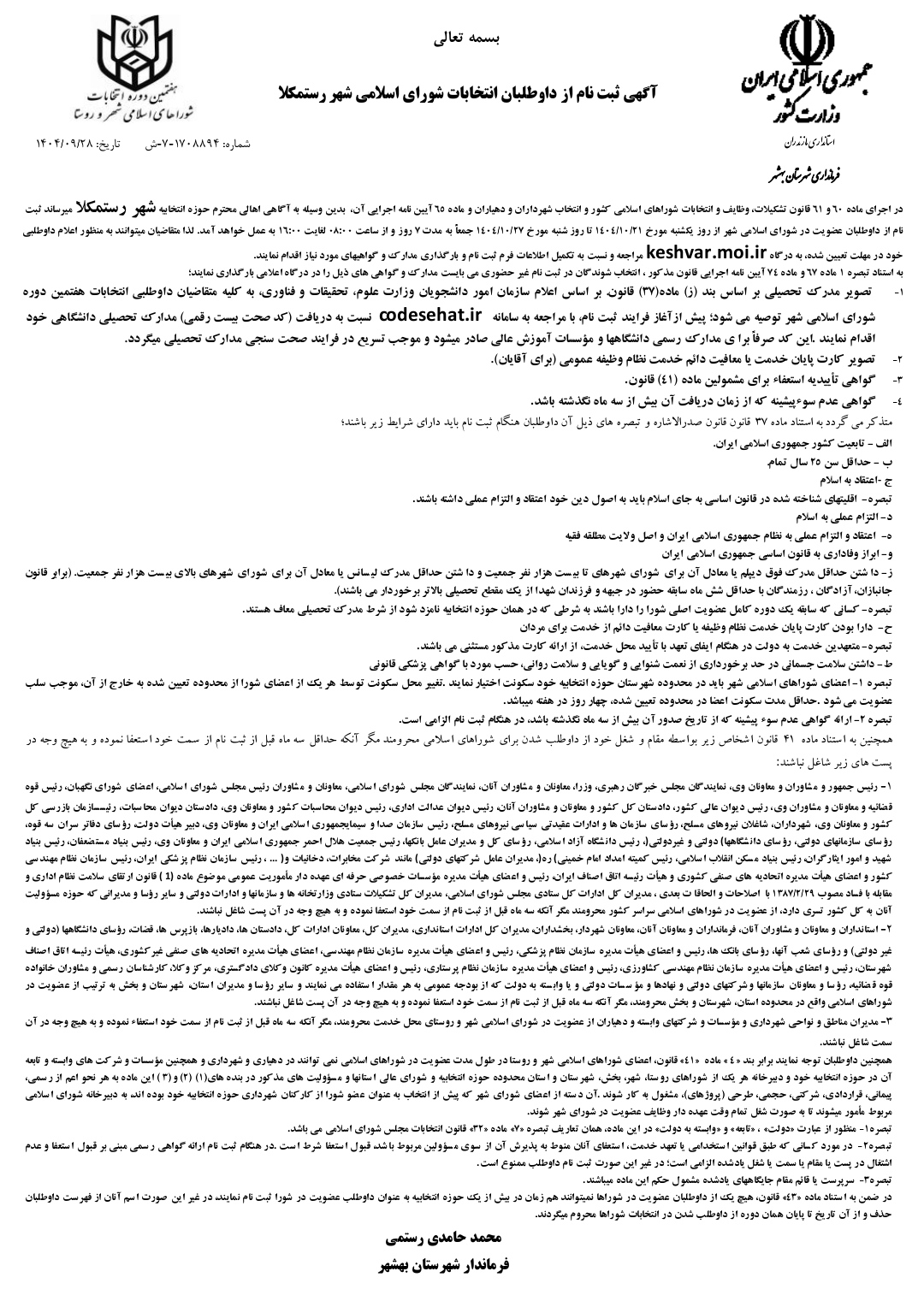 1- تصویر مدرک تحصیلی بر اساس بند (ز) ماده (72) قانون. بر اساس اعلام سازمان امور دانشجویان وزارت علوم، تحقیقات و فناوری، به کلیه متقاضیان داوطلبی انتخابات هفتمین دوره شورای اسلامی شهر توصیه می شود؛ پیش ازآغاز فرایند ثبت نام، با مراجعه به سامانه codesehat.ir نسبت به دریافت(کد صحت بیست رقمی)مدارک تحصیلی دانشگاهی خود اقدام نمایند .این کد صرفا برای مدارک رسمی دانشگاهها و مؤسسات آموزش عالی صادر میشود و موجب تسریع در فرایند صحت سنجی مدارک تحصیلی میگردد.