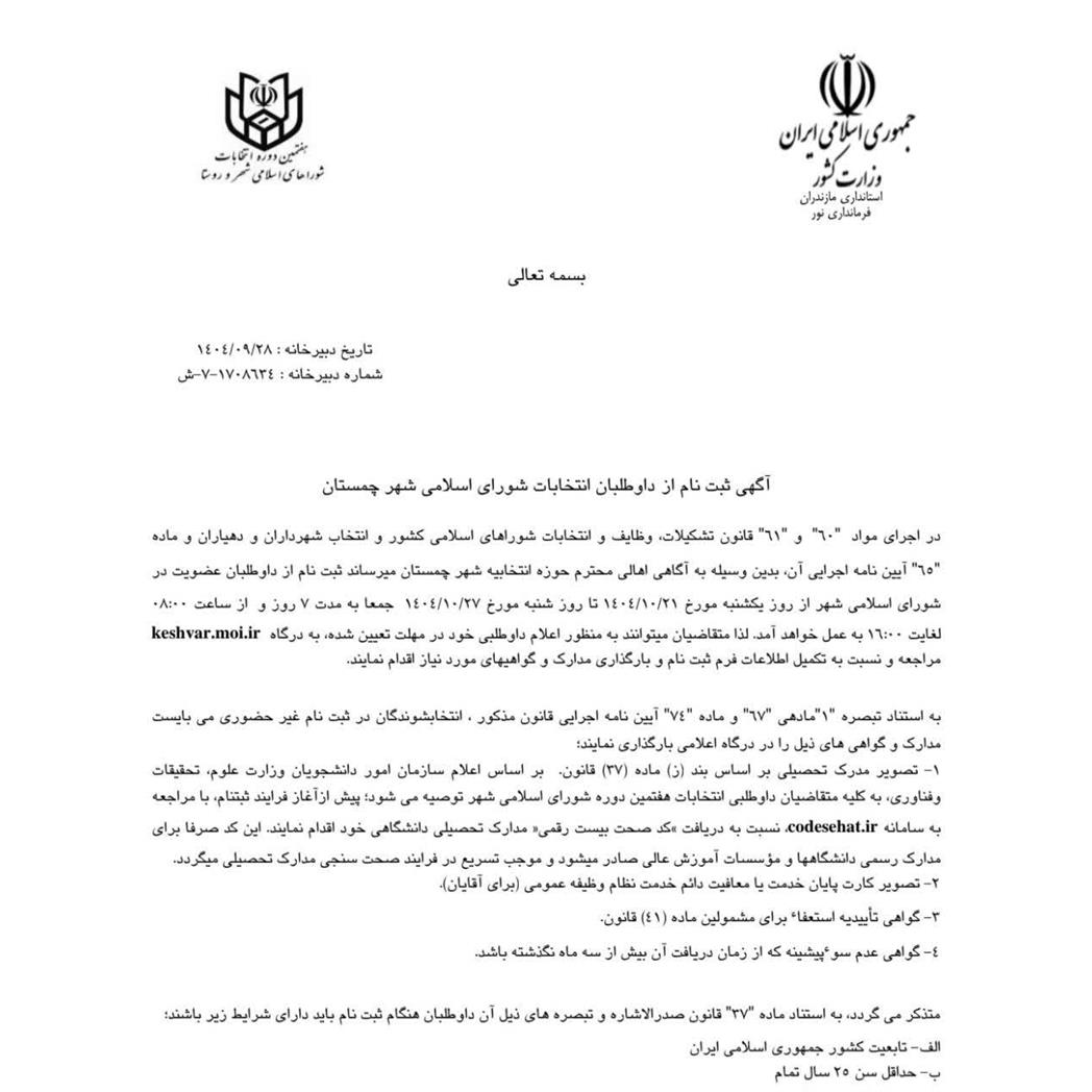 آگهی ثبتنام از داوطلبان انتخابات شورای اسلامی شهر چمستان