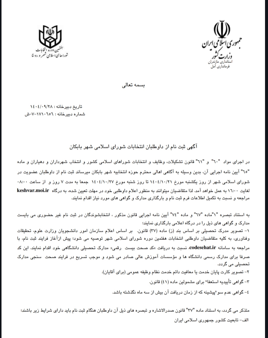 آگهی ثبت نام از داوطلبان انتخابات شورای اسلامی شهر بابکان