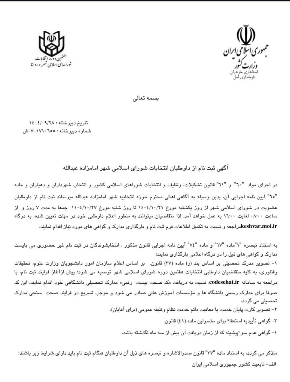 آگهی ثبت نام از داوطلبان انتخابات شورای اسلامی شهر امامزاده عبدالله