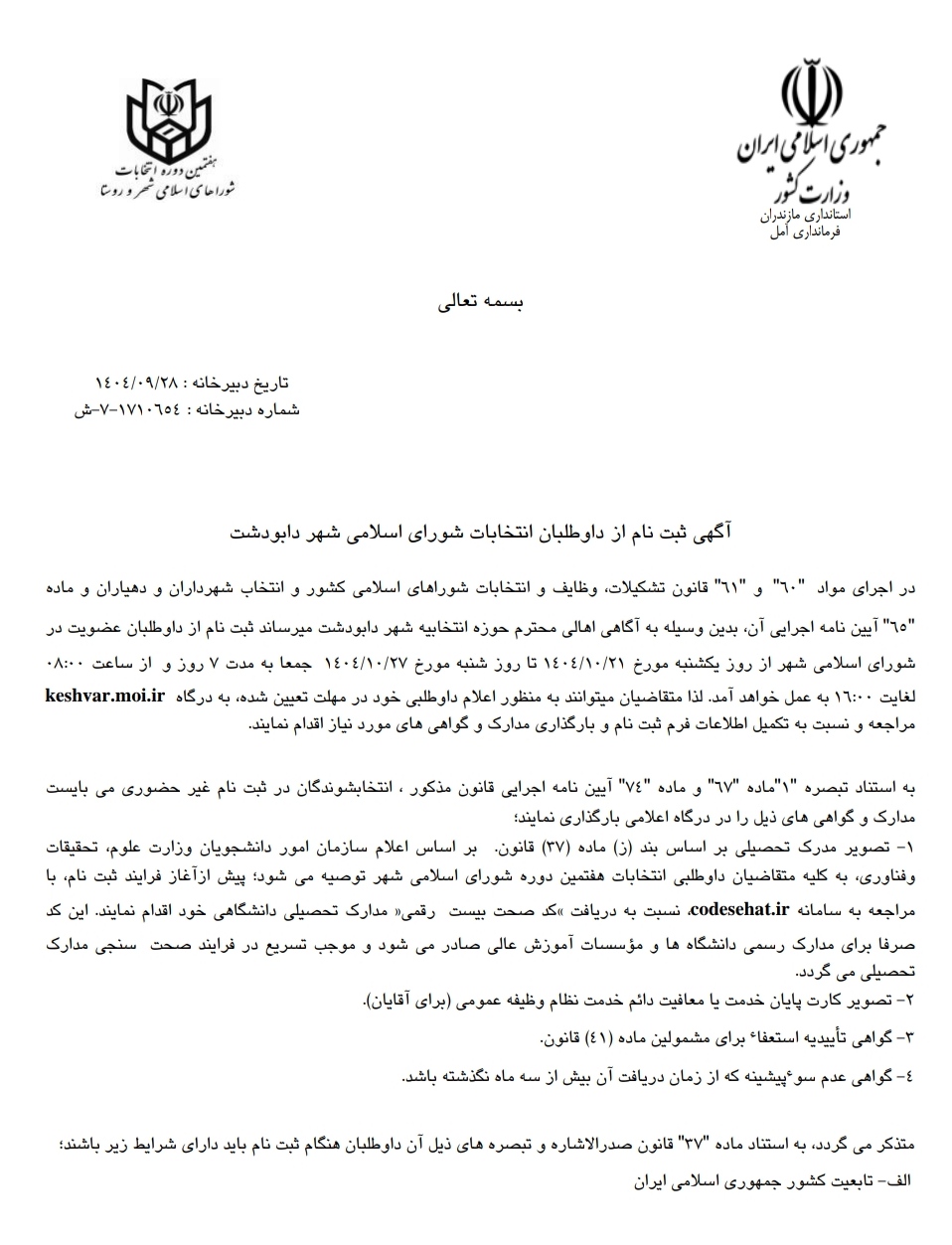 آگهی ثبت نام از داوطلبان انتخابات شورای اسلامی شهر دابودشت