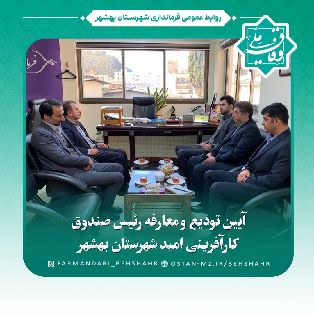 آیین تودیع و معارفه رئیس صندوق کارآفرینی امید شهرستان بهشهر با حضور محمدحسین باقری سرپرست صندوق کارآفرینی امید مازندران و مهندس حامدی فرماندار شهرستان بهشهر در محل فرمانداری برگزار شد و آقای مطیعی به عنوان رئیس جدید این صندوق معرفی شد.